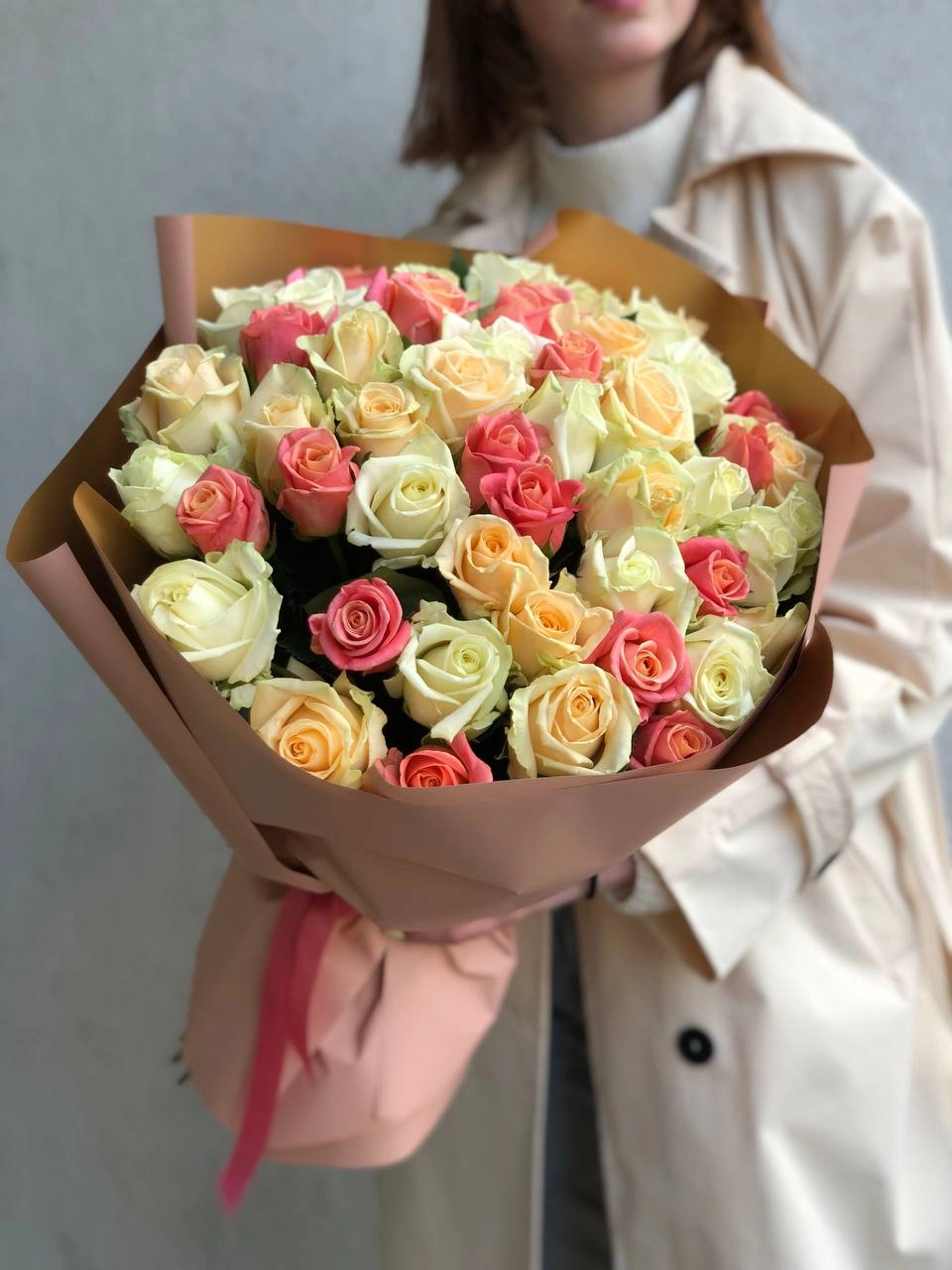 Букет из 101 розы сорта Пич Аваланж- роскошный подарок на День Рождения, свадьбу, торжественную выписку из роддома, помолвку. Изумительные цветы нежного оттенка кофе с молоком способны помочь признаться в любви, извиниться и поздравить.