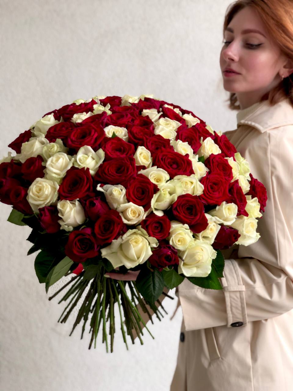 Букет из 101 розы сорта Софи Лорен – это настоящий символ роскоши, страсти и восхищения. Великолепные алые бутоны с бархатными лепестками покоряют своей глубиной цвета и благородством формы, создавая по-настоящему эффектную композицию.