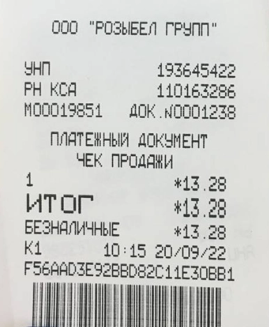 Образец кассового чека.